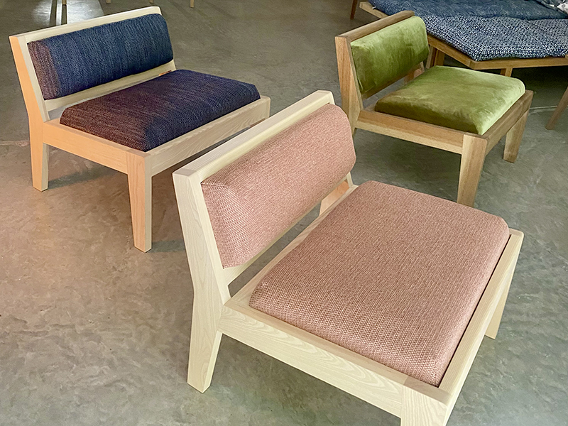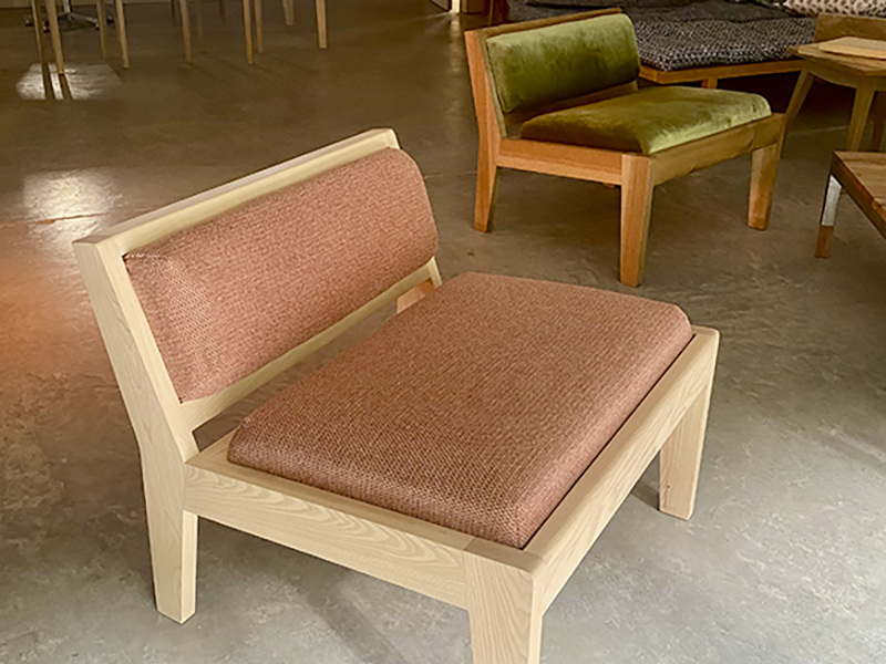 CRÉATION MOBILIER Fauteuils ARC Frêne ou noyer huilé. Garniture en mousse et tissu – couture Qwobolo