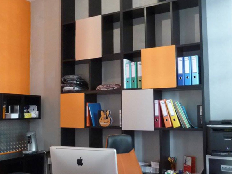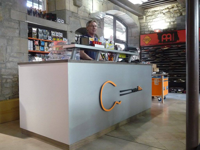 AGENCEMENT PRO CROSSROAD, magasin de musique Création d’un comptoir d’accueil. Structure en MDF vernis ou laqué noir. Plateau et habillage en stratifié alu brossé et noir ; alèses plateau en hêtre huilé noir ; pieds tournés en hêtre vernis. 2014