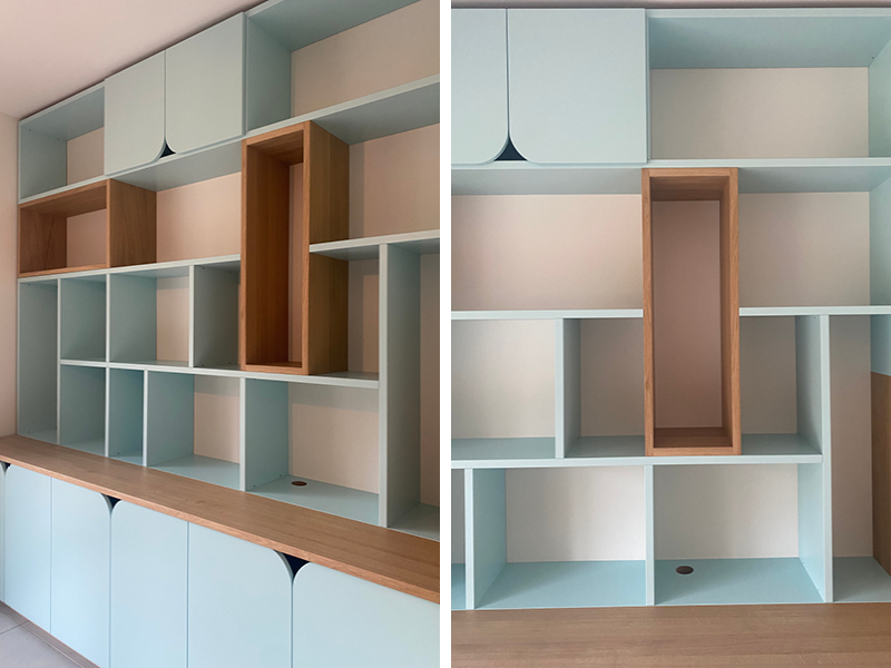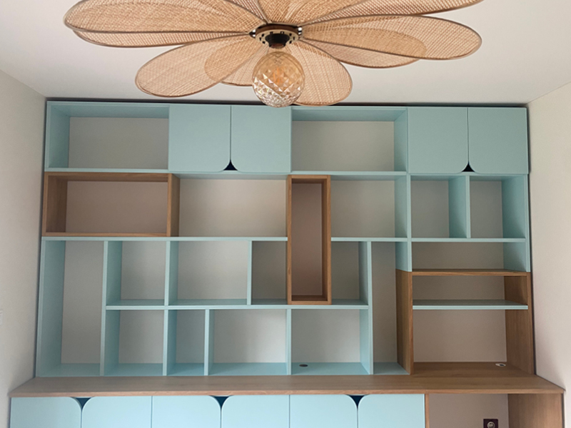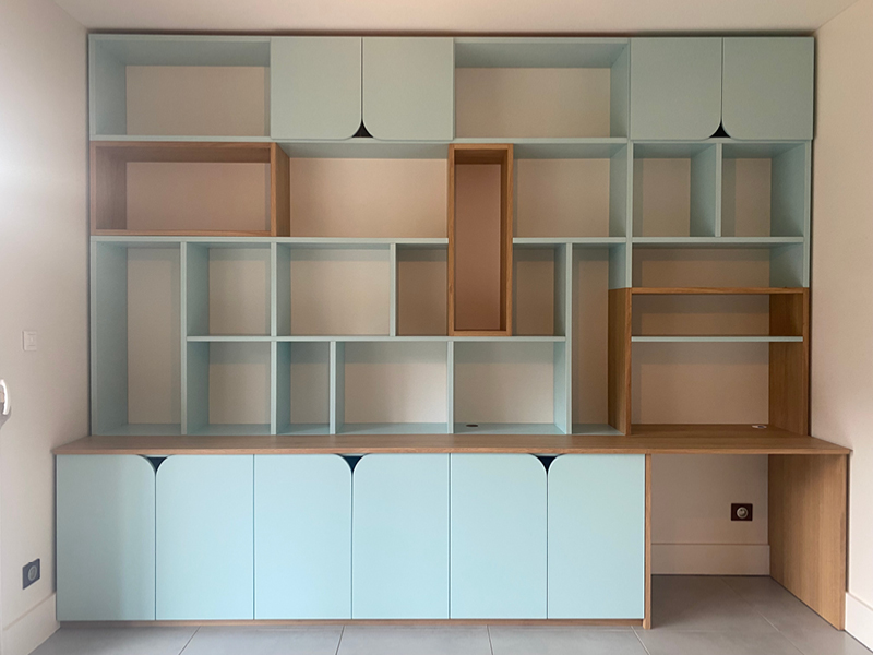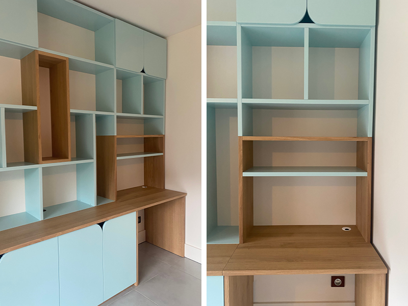 Structure et porte en médium laqué bleu céladon. Socle, plateau, niche et bureau en chêne vernis mat.